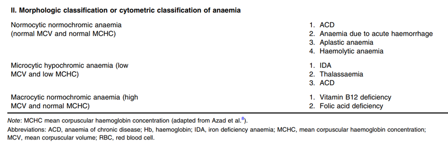 A morfologia da anemia é descrita pela cor, tamanho e forma dos eritrócitos. Usando este sistema de classificação as anemias são classificadas da seguinte forma, a saber: anemia hipocrômica microcítica (volume corpuscular médio VCM<80fL), anemia macrocítica (VCM >100fL), anemia normocítica normocrômica (VCM entre 80 e 100fL). As principais causas de anemia microcítica incluem anemia por deficiência de ferro, talassemia e anemia por doença crônica, com absorção de ferro comprometida devido a inflamação tissular, tal como na doença inflamatória intestinal. Anemia por deficiência de ferro é diagnosticada na presença de ferritina <30 ou <100 µg/L, na ausência/presença da enfermidade ativa, respectivamente. Inflamação através dos mecanismos mediados por citocinas pode desencadear aumento da Hepcidina e diminuição dos níveis de ferro circulante, mas não da ferritina, por isso na presença de evidências bioquímicas e/ou clínicas de inflamação, a anemia por doença crônica deve ser diagnosticada caso os níveis séricos da ferritina encontrem-se aumentados e a saturação da transferrina se encontre diminuída.